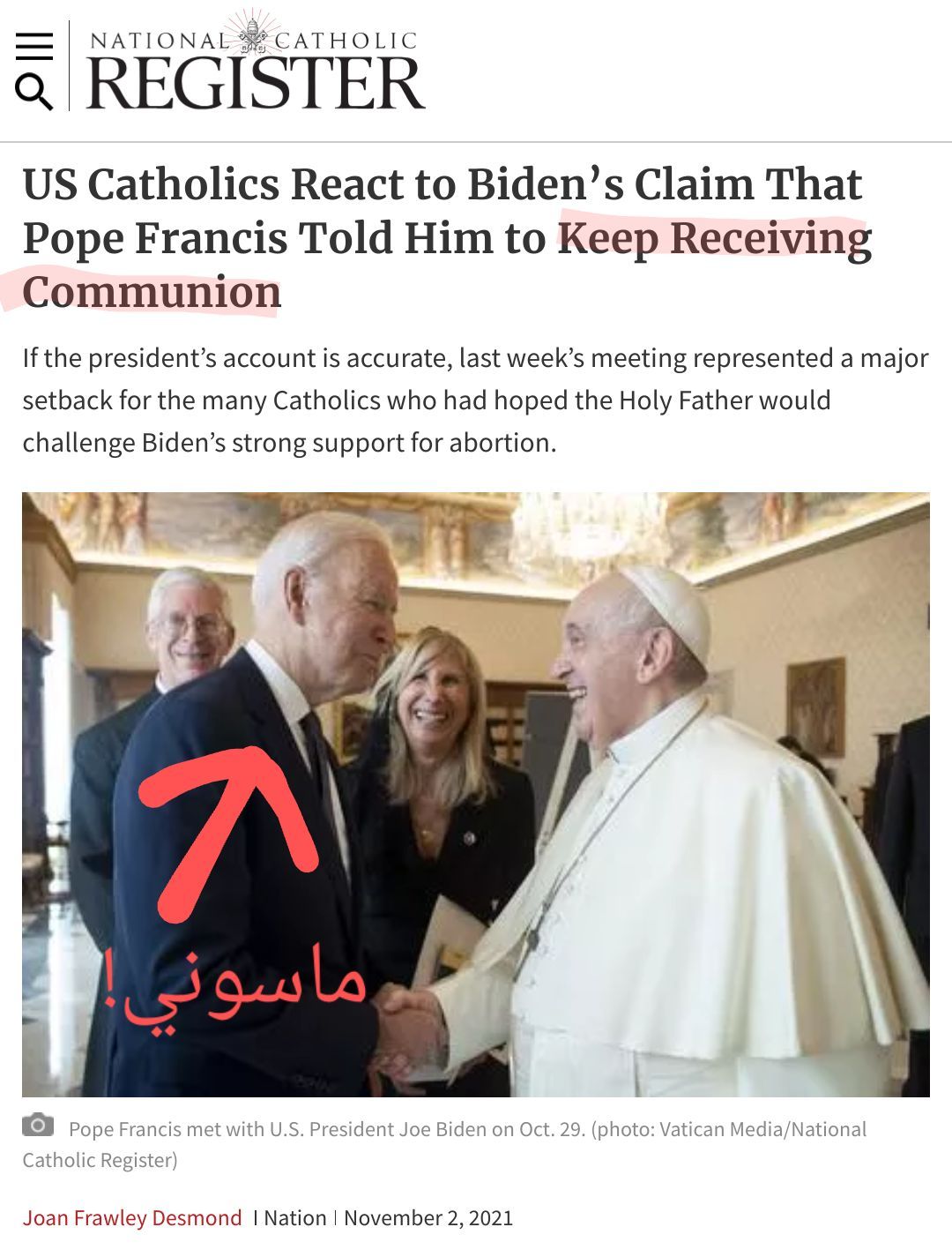بايدن هذا كان قد حُرم من مطران واشنطن من التناول بسبب مواقفه المؤيدة لموضات العصر، فقام بالسّفر إلى الفاتيكان الأسبوع نفسه وتناول من البابا فرنسيس شخصياً وعندها أخبره البابا هذا الكلام متحدّياً سلطة الكنيسة ورأسها (الرب يسوع).