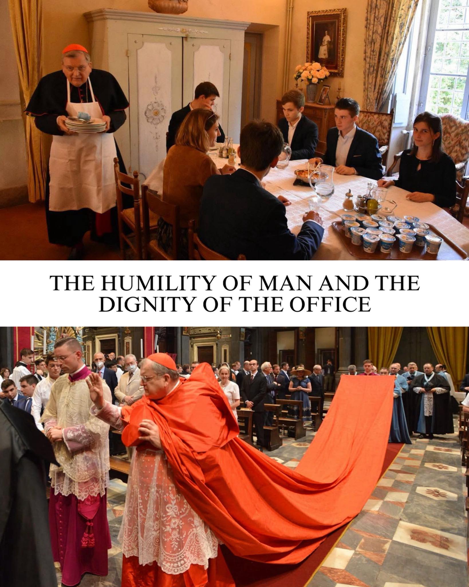 And in this photo we see exactly that point lived out by Cardinal Burke. The one on top shows him in his basic cassock, wearing a kitchen apron and serving plates to his guests. Simple, ordinary, just a man doing normal hospitality. But the one on the bottom shows him inside the church processing at mass Mass in full ceremonial dress. Full regalia, the whole tradition, he even wears the cappa magna. That is not vanity, that is the office. The man disappears and the priesthood of Christ takes over. That is how it should be.